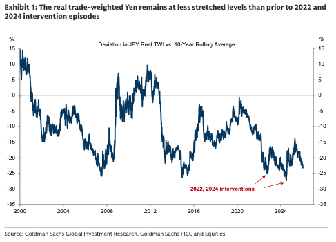 As shown in Exhibit 1, JPY has not yet reached the same level of weakness observed before previous interventions. Its underperformance has largely reflected higher fiscal risk premiums rather than unexplained factors, but there is no reason to dismiss the possibility of earlier direct operations. Intervention discussions appear to be gaining momentum, with verbal warnings intensifying—most recently on Friday, when Finance Minister Katayama stated they are “prepared to take decisive action, including all available options.” A “rate check” could be the next step, which has historically preceded actual intervention. For instance, the last reported rate check occurred shortly before the July 2024 operations and similarly in September 2022, about a week before intervention.