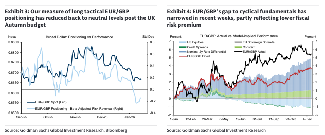 GBP: Analyzing the rebound. We identify three key fundamental drivers behind Sterling's outperformance over the past two months. First, the smooth delivery of the Autumn budget has alleviated concerns surrounding the UK’s fiscal and political landscape, providing sustained relief for the currency. This is evidenced by the continued reduction in fiscal risk premiums post-budget, as seen in the unwinding of long tactical EUR/GBP positions in recent weeks (Exhibit 3) and the narrowing gap between actual and model-implied performance in our GSBEER framework (Exhibit 4).